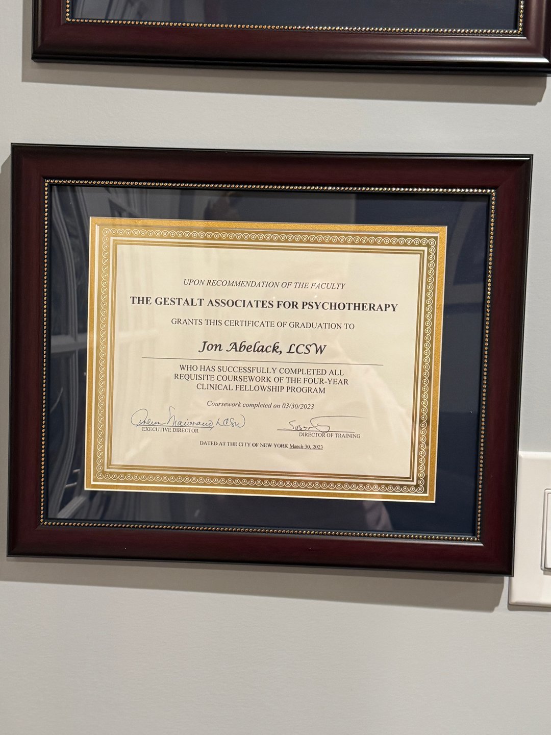 Hello! My name is Jon Abelack. I am a couples counselor and therapist in New Canaan, CT, able to see patients locally. I am also licensed to provide therapy in all of Connecticut and New York for those that prefer remote therapy. My focus is on work, career, relationships, and peak performance coaching. I work with people who are under intense corporate pressure and eager for a sense of relief, disappointed with how their life is turning out, finding it challenging to communicate with their partner, struggling with an unhealthy work-life balance, considering a career change, desiring to strengthening their relationships, those experiencing burnout, and more. If you are looking for couples counseling or therapy, please reach out today.
